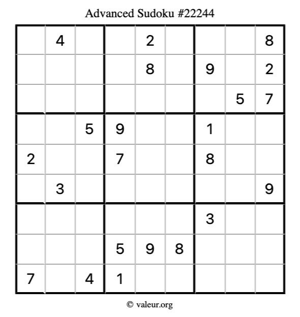 Here is our printable Advanced Sudoku Puzzle #22244. You are welcome to print a copy for yourself and solve it the old-fashioned way with a pencil and an eraser!