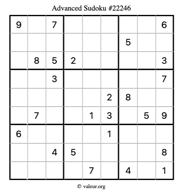 Here is our printable Advanced Sudoku Puzzle #22246. You are welcome to print a copy for yourself and solve it the old-fashioned way with a pencil and an eraser!