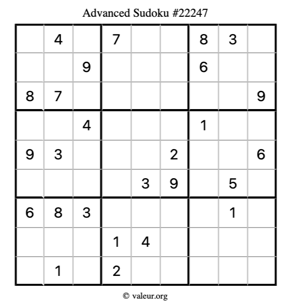 Here is our printable Advanced Sudoku Puzzle #22247. You are welcome to print a copy for yourself and solve it the old-fashioned way with a pencil and an eraser!