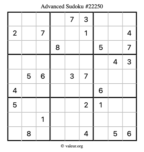 Here is our printable Advanced Sudoku Puzzle #22250. You are welcome to print a copy for yourself and solve it the old-fashioned way with a pencil and an eraser!
