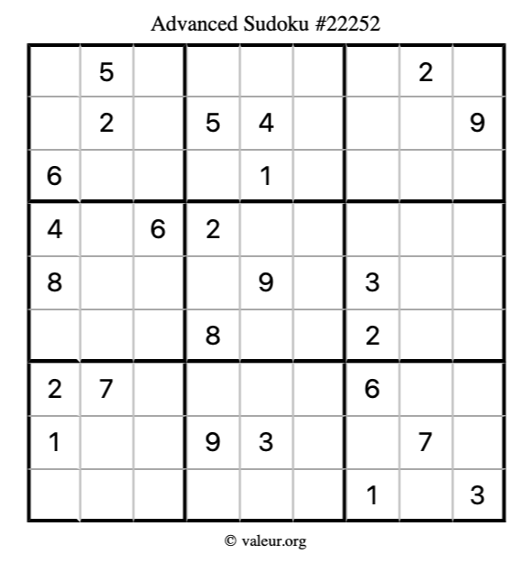 Here is our printable Advanced Sudoku Puzzle #22252. You are welcome to print a copy for yourself and solve it the old-fashioned way with a pencil and an eraser!