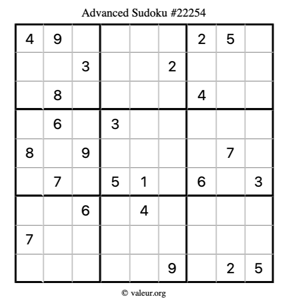 Here is our printable Advanced Sudoku Puzzle #22254. You are welcome to print a copy for yourself and solve it the old-fashioned way with a pencil and an eraser!