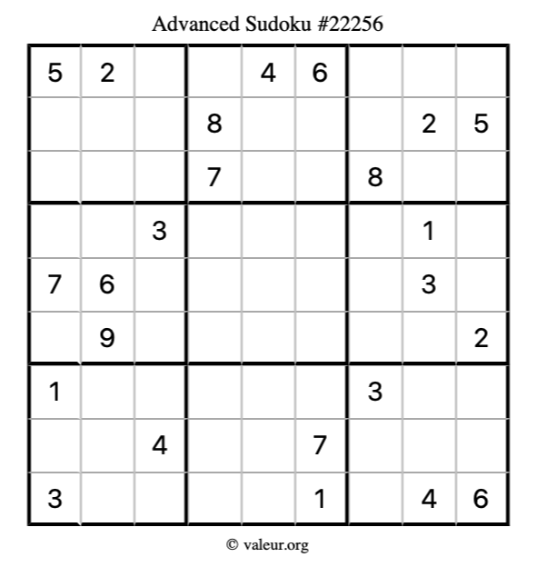 Here is our printable Advanced Sudoku Puzzle #22256. You are welcome to print a copy for yourself and solve it the old-fashioned way with a pencil and an eraser!