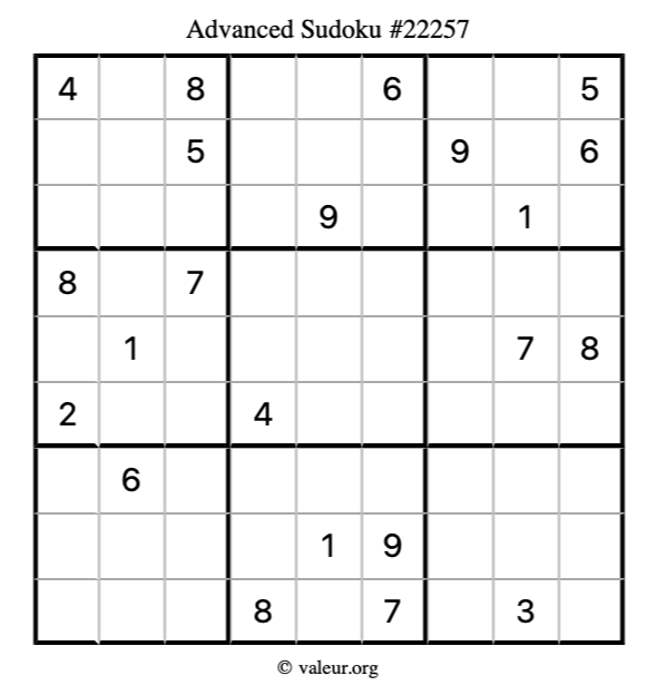 Here is our printable Advanced Sudoku Puzzle #22257. You are welcome to print a copy for yourself and solve it the old-fashioned way with a pencil and an eraser!