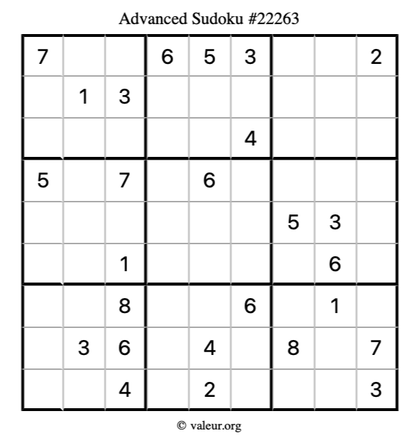 Here is our printable Advanced Sudoku Puzzle #22263. You are welcome to print a copy for yourself and solve it the old-fashioned way with a pencil and an eraser!