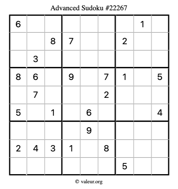 Here is our printable Advanced Sudoku Puzzle #22267. You are welcome to print a copy for yourself and solve it the old-fashioned way with a pencil and an eraser!