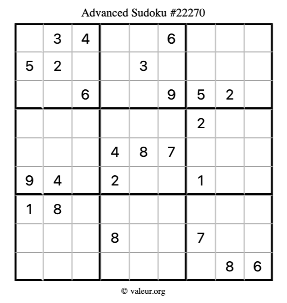 Here is our printable Advanced Sudoku Puzzle #22270. You are welcome to print a copy for yourself and solve it the old-fashioned way with a pencil and an eraser!
