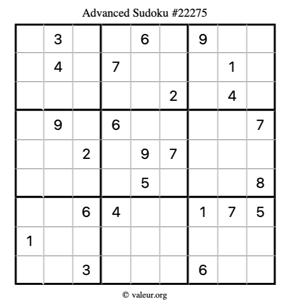 Here is our printable Advanced Sudoku Puzzle #22275. You are welcome to print a copy for yourself and solve it the old-fashioned way with a pencil and an eraser!