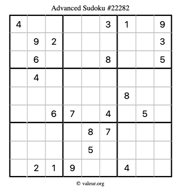 Here is our printable Advanced Sudoku Puzzle #22282. You are welcome to print a copy for yourself and solve it the old-fashioned way with a pencil and an eraser!
