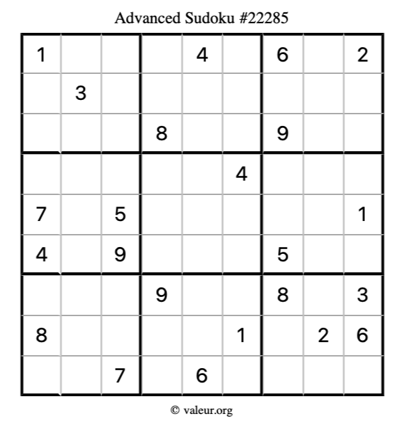 Here is our printable Advanced Sudoku Puzzle #22285. You are welcome to print a copy for yourself and solve it the old-fashioned way with a pencil and an eraser!