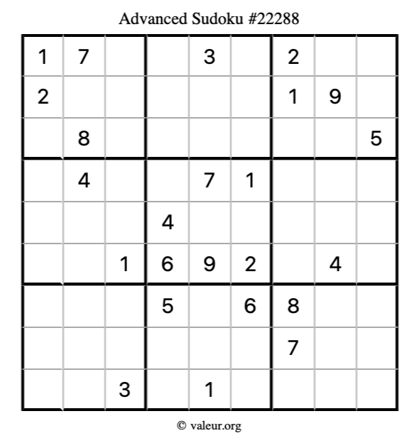 Here is our printable Advanced Sudoku Puzzle #22288. You are welcome to print a copy for yourself and solve it the old-fashioned way with a pencil and an eraser!
