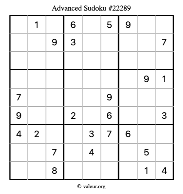 Here is our printable Advanced Sudoku Puzzle #22289. You are welcome to print a copy for yourself and solve it the old-fashioned way with a pencil and an eraser!