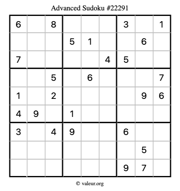 Here is our printable Advanced Sudoku Puzzle #22291. You are welcome to print a copy for yourself and solve it the old-fashioned way with a pencil and an eraser!