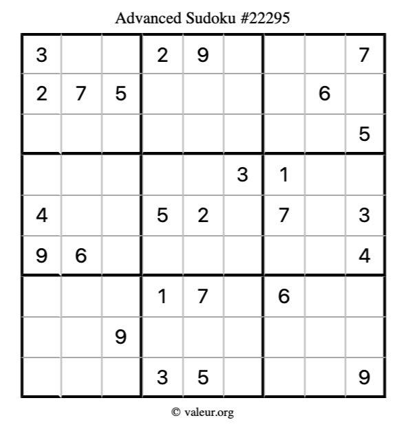 Advanced Sudoku puzzle #22295 is not the only advanced Sudoku puzzle in our database. We have thousands of advanced Sudoku puzzles that you can print and solve. Check them out here!