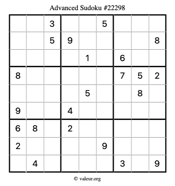 Here is our printable Advanced Sudoku Puzzle #22298. You are welcome to print a copy for yourself and solve it the old-fashioned way with a pencil and an eraser!