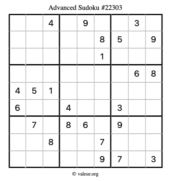 Here is our printable Advanced Sudoku Puzzle #22303. You are welcome to print a copy for yourself and solve it the old-fashioned way with a pencil and an eraser!