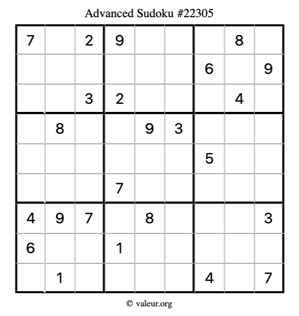 Here is our printable Advanced Sudoku Puzzle #22305. You are welcome to print a copy for yourself and solve it the old-fashioned way with a pencil and an eraser!