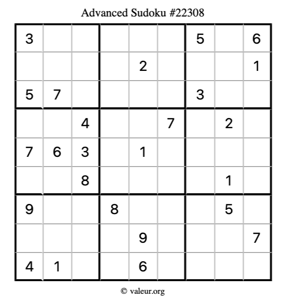 Here is our printable Advanced Sudoku Puzzle #22308. You are welcome to print a copy for yourself and solve it the old-fashioned way with a pencil and an eraser!