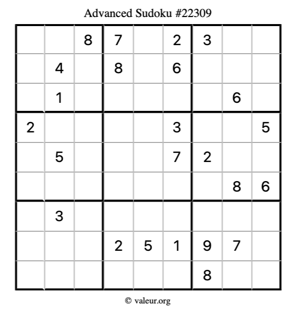 Here is our printable Advanced Sudoku Puzzle #22309. You are welcome to print a copy for yourself and solve it the old-fashioned way with a pencil and an eraser!