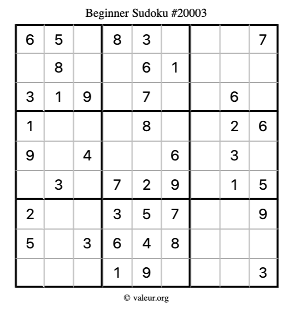 Here is our printable Beginner Sudoku Puzzle #20003. You are welcome to print a copy for yourself and solve it the old-fashioned way with a pencil and an eraser!