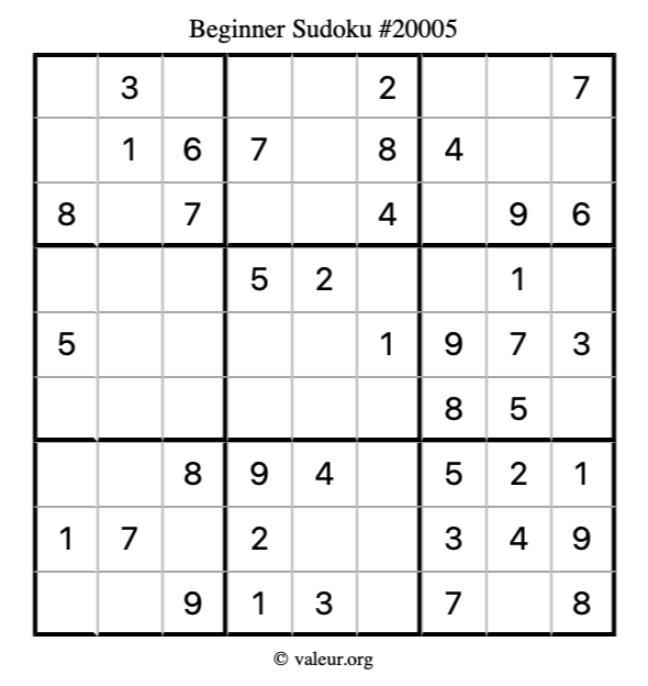 Here is our printable Beginner Sudoku Puzzle #20005. You are welcome to print a copy for yourself and solve it the old-fashioned way with a pencil and an eraser!