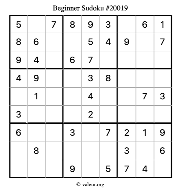 Here is our printable Beginner Sudoku Puzzle #20019. You are welcome to print a copy for yourself and solve it the old-fashioned way with a pencil and an eraser!