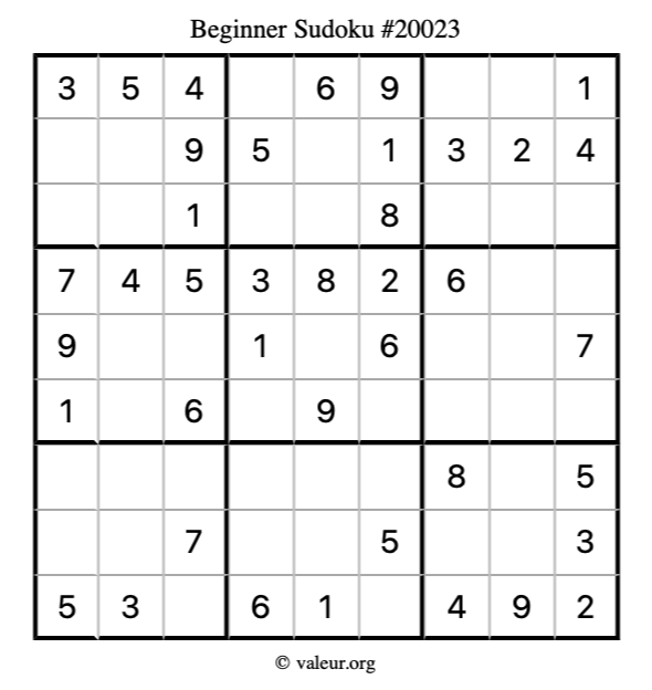 Here is our printable Beginner Sudoku Puzzle #20023. You are welcome to print a copy for yourself and solve it the old-fashioned way with a pencil and an eraser!