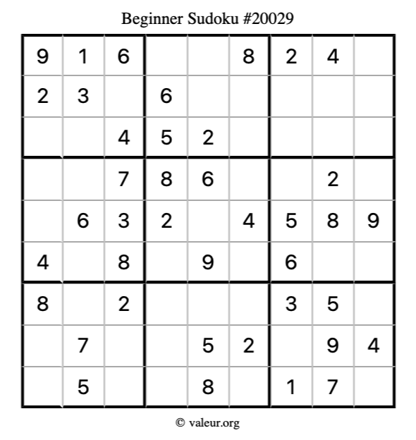Here is our printable Beginner Sudoku Puzzle #20029. You are welcome to print a copy for yourself and solve it the old-fashioned way with a pencil and an eraser!