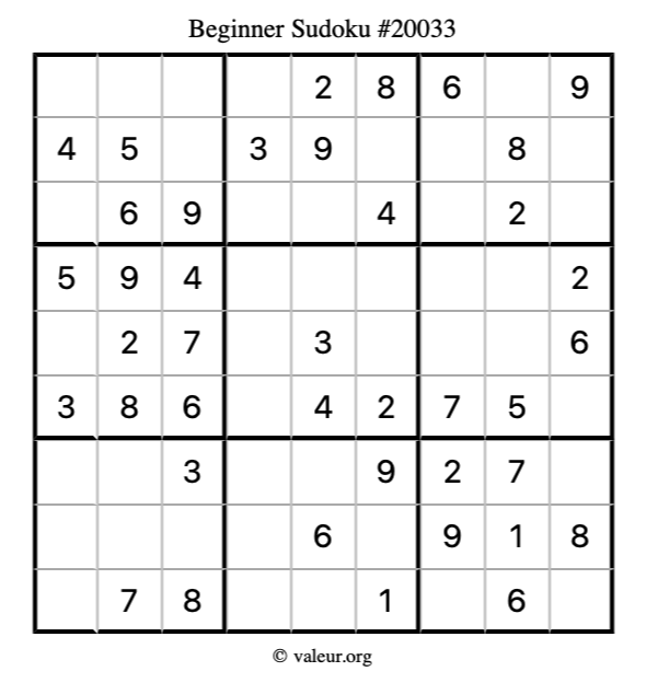 Here is our printable Beginner Sudoku Puzzle #20033. You are welcome to print a copy for yourself and solve it the old-fashioned way with a pencil and an eraser!