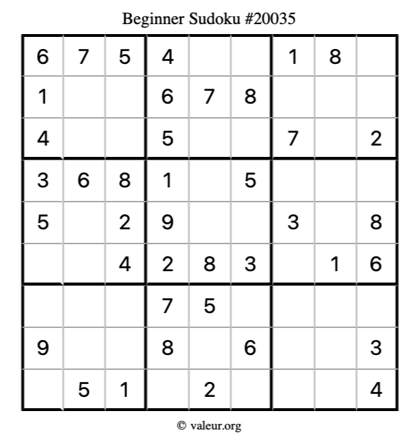 Here is our printable Beginner Sudoku Puzzle #20035. You are welcome to print a copy for yourself and solve it the old-fashioned way with a pencil and an eraser!