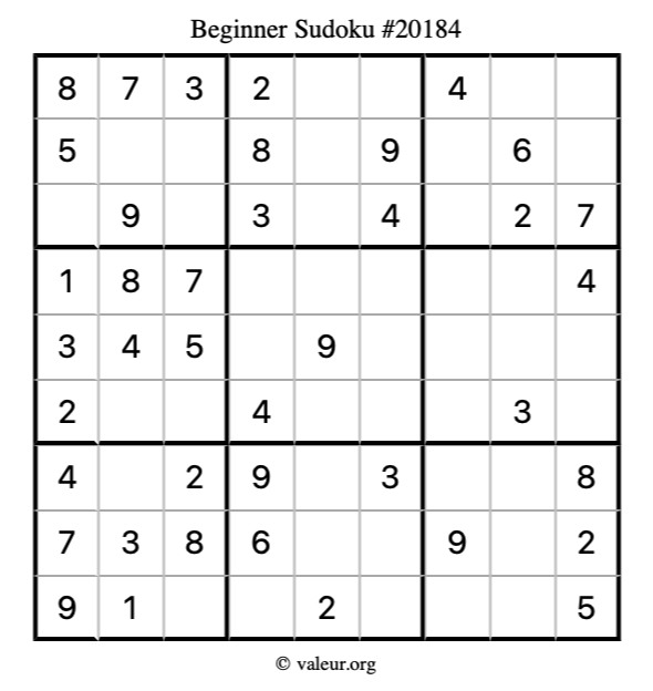 Here is our printable Beginner Sudoku Puzzle #20184. You are welcome to print a copy for yourself and solve it the old-fashioned way with a pencil and an eraser!