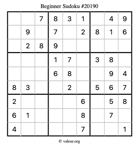 Here is our printable Beginner Sudoku Puzzle #20190. You are welcome to print a copy for yourself and solve it the old-fashioned way with a pencil and an eraser!