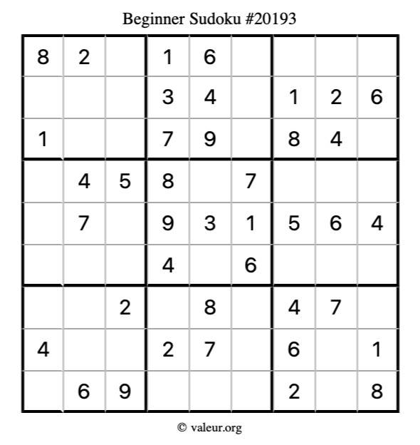 Here is our printable Beginner Sudoku Puzzle #20193. You are welcome to print a copy for yourself and solve it the old-fashioned way with a pencil and an eraser!