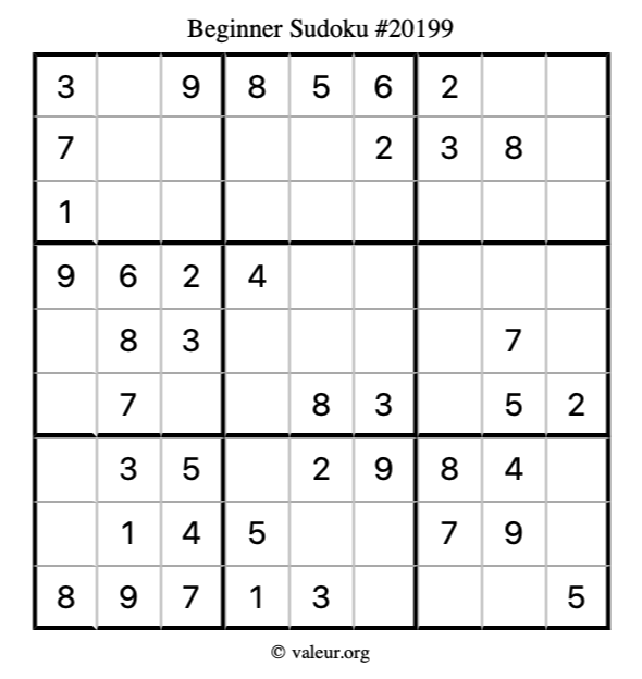 Here is our printable Beginner Sudoku Puzzle #20199. You are welcome to print a copy for yourself and solve it the old-fashioned way with a pencil and an eraser!