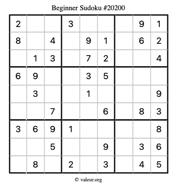 Here is our printable Beginner Sudoku Puzzle #20200. You are welcome to print a copy for yourself and solve it the old-fashioned way with a pencil and an eraser!