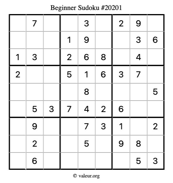 Here is our printable Beginner Sudoku Puzzle #20201. You are welcome to print a copy for yourself and solve it the old-fashioned way with a pencil and an eraser!