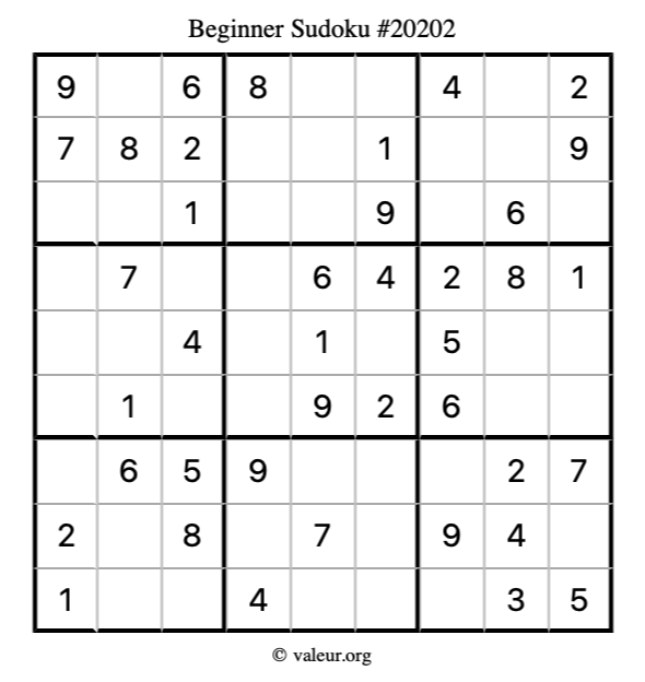 Here is our printable Beginner Sudoku Puzzle #20202. You are welcome to print a copy for yourself and solve it the old-fashioned way with a pencil and an eraser!