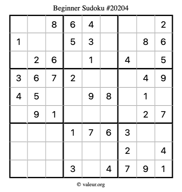 Here is our printable Beginner Sudoku Puzzle #20204. You are welcome to print a copy for yourself and solve it the old-fashioned way with a pencil and an eraser!