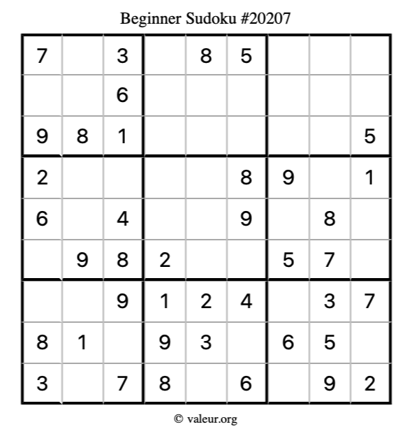 Here is our printable Beginner Sudoku Puzzle #20207. You are welcome to print a copy for yourself and solve it the old-fashioned way with a pencil and an eraser!