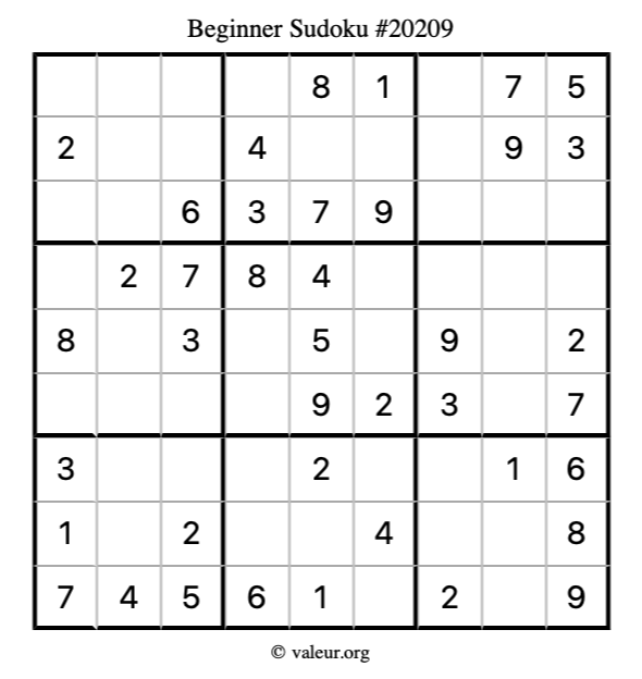 Here is our printable Beginner Sudoku Puzzle #20209. You are welcome to print a copy for yourself and solve it the old-fashioned way with a pencil and an eraser!