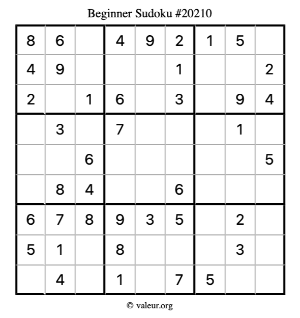 Here is our printable Beginner Sudoku Puzzle #20210. You are welcome to print a copy for yourself and solve it the old-fashioned way with a pencil and an eraser!