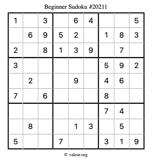 Here is our printable Beginner Sudoku Puzzle #20211. You are welcome to print a copy for yourself and solve it the old-fashioned way with a pencil and an eraser!