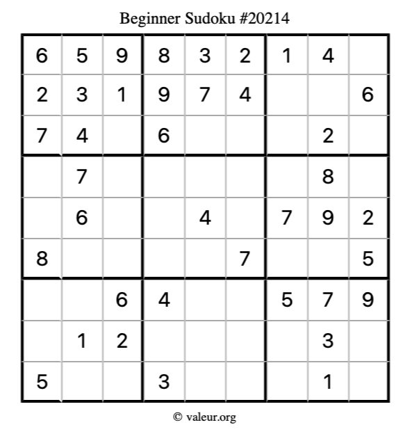 Here is our printable Beginner Sudoku Puzzle #20214. You are welcome to print a copy for yourself and solve it the old-fashioned way with a pencil and an eraser!