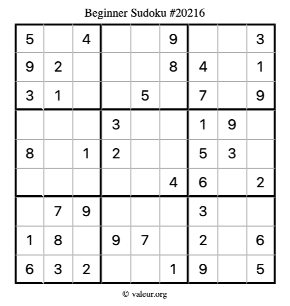 Here is our printable Beginner Sudoku Puzzle #20216. You are welcome to print a copy for yourself and solve it the old-fashioned way with a pencil and an eraser!