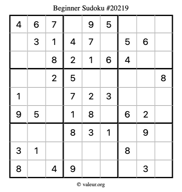 Here is our printable Beginner Sudoku Puzzle #20219. You are welcome to print a copy for yourself and solve it the old-fashioned way with a pencil and an eraser!