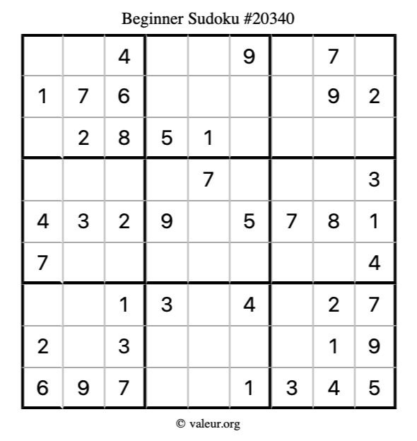 Here is our printable Beginner Sudoku Puzzle #20340. You are welcome to print a copy for yourself and solve it the old-fashioned way with a pencil and an eraser!