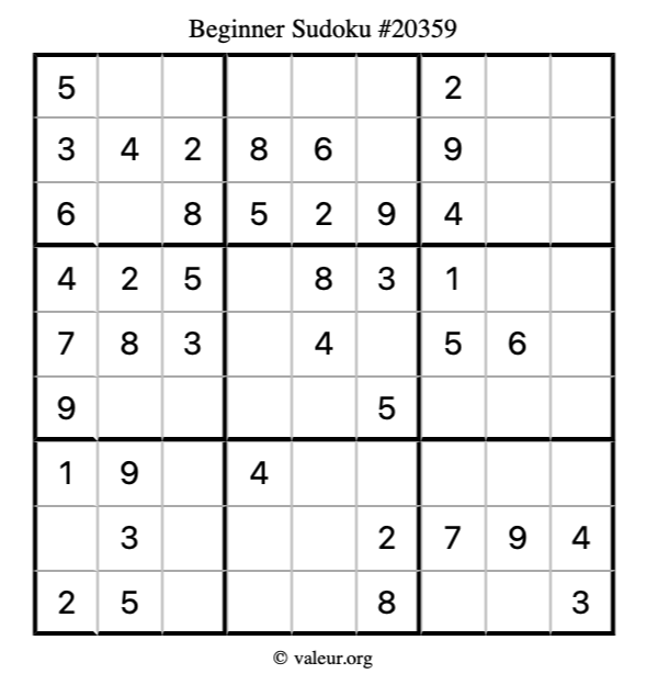 Here is our printable Beginner Sudoku Puzzle #20359. You are welcome to print a copy for yourself and solve it the old-fashioned way with a pencil and an eraser!