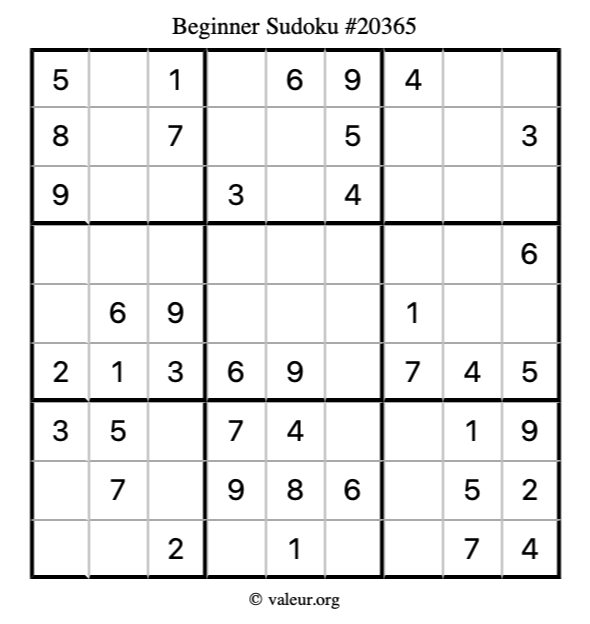 Here is our printable Beginner Sudoku Puzzle #20365. You are welcome to print a copy for yourself and solve it the old-fashioned way with a pencil and an eraser!