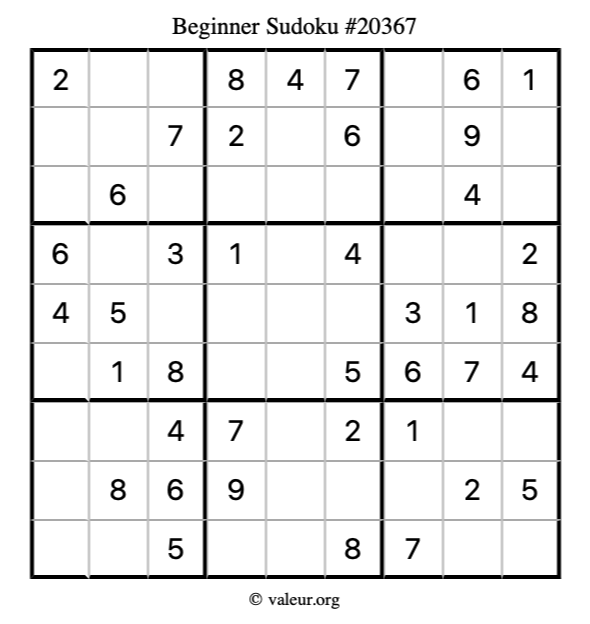 Here is our printable Beginner Sudoku Puzzle #20367. You are welcome to print a copy for yourself and solve it the old-fashioned way with a pencil and an eraser!