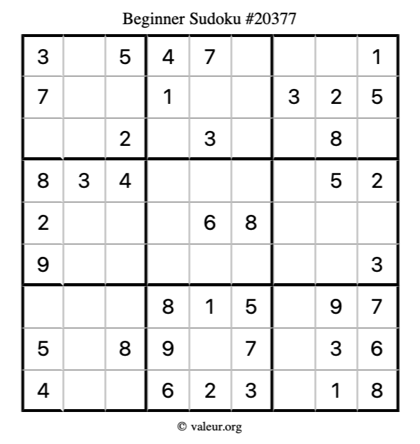 Here is our printable Beginner Sudoku Puzzle #20377. You are welcome to print a copy for yourself and solve it the old-fashioned way with a pencil and an eraser!